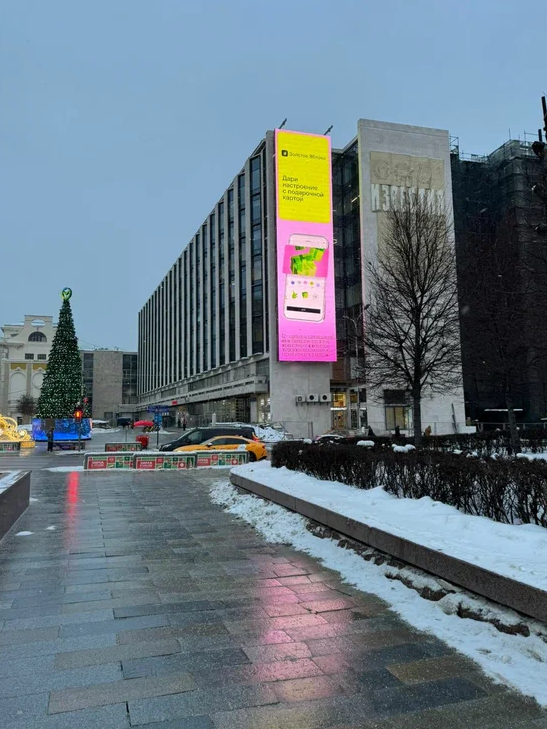 Примеры рекламы на медиафасаде г. Москва, Известия, улица Тверская, д. 18, к.1 представлены на фото: