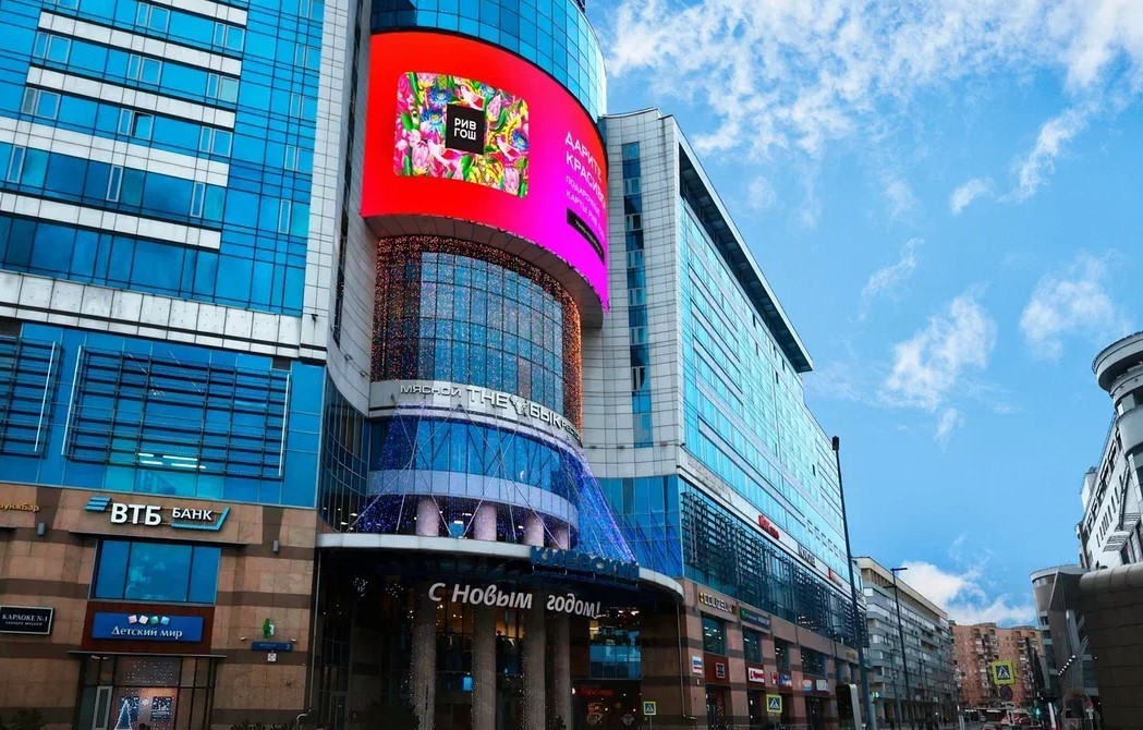Примеры рекламы на медиафасаде г. Москва, ТГК Киевский, ул. Киевская, д.2 представлены на фото: